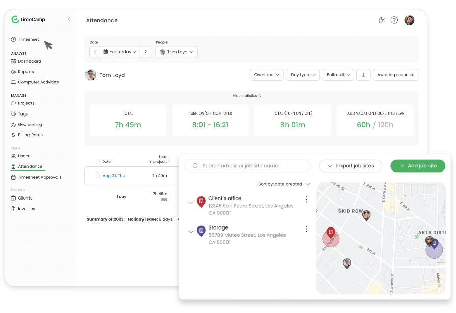 Apps like Hubstaff, Apploye, and Connecteam provide GPS-based tracking and geofencing, letting you see when field employees arrive, leave, or move between job sites.