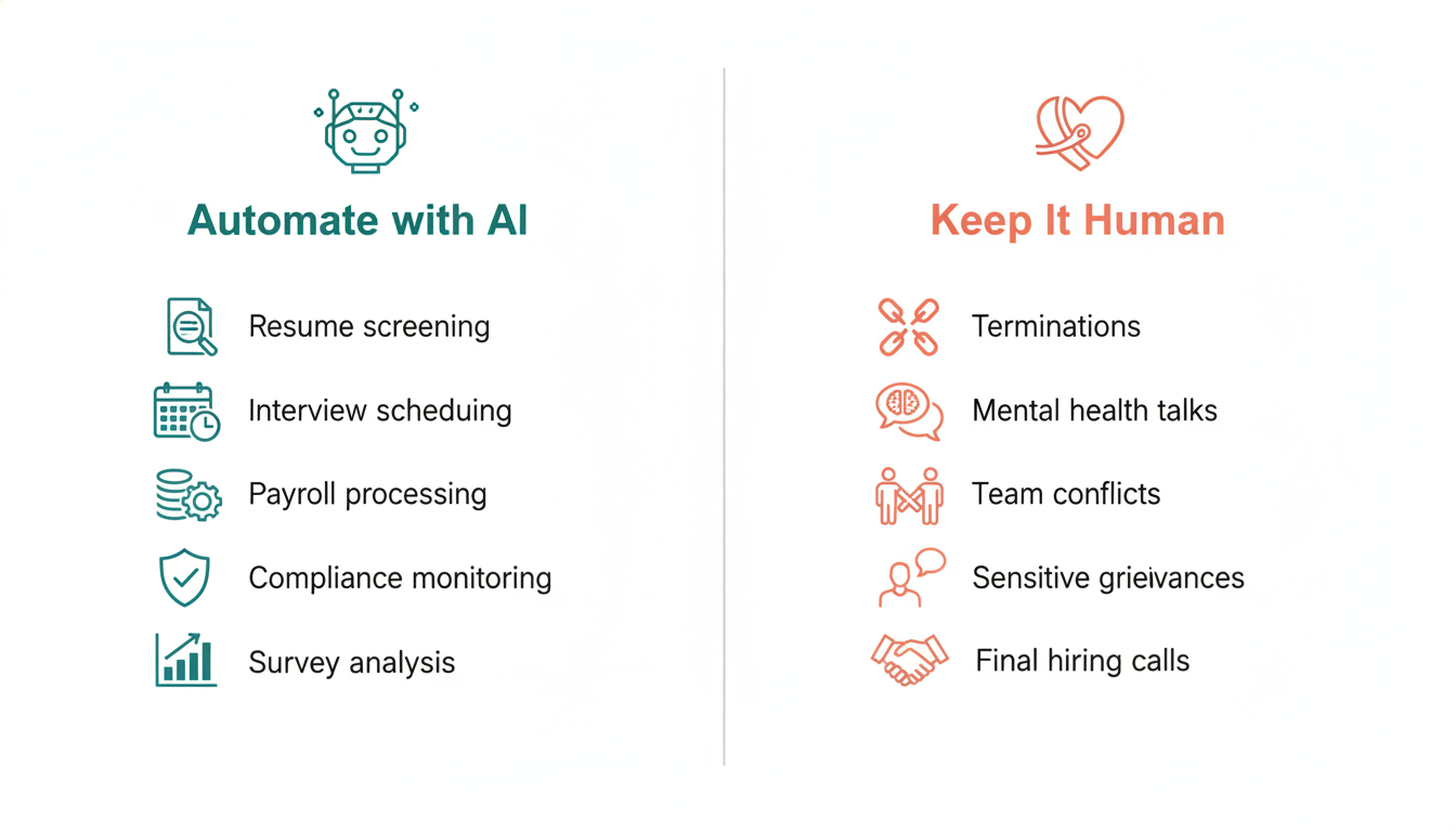 This is the section that separates good AI strategy from bad one. Not everything in HR should be handed to an algorithm. Some things require a real person in the room.
