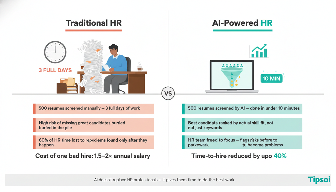 But here’s what most articles won’t tell you: AI doesn’t replace the human part of HR. It removes the exhausting stuff so humans can focus on the meaningful stuff.