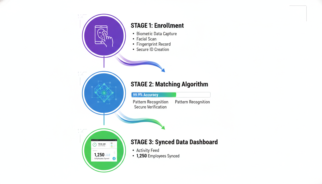 If verification succeeds, the system records the timestamp, employee ID, and location. Match decisions happen in under one second.