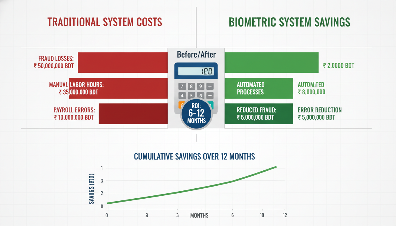 Basic fingerprint systems start around BDT 15,000-25,000 per device. Facial recognition systems range from BDT 30,000-60,000. Cloud software subscriptions typically cost BDT 50-200 per employee monthly. Most businesses see ROI within 6-12 months.