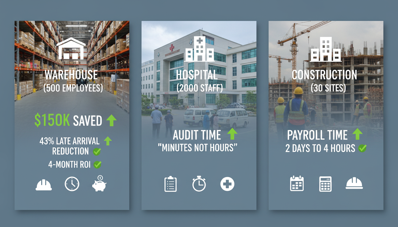 A 500-employee distribution center was losing approximately $150,000 annually to time theft and payroll errors. After implementing fingerprint scanners at all entry points, buddy punching stopped immediately. Late arrivals dropped by 43% within two months. The system paid for itself in under four months.
