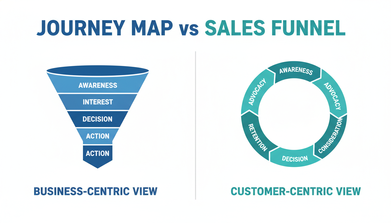 A sales funnel is designed from the business’s perspective, focused on moving prospects toward a sale. A customer journey map is designed from the customer’s perspective, focused on their actual experience, emotions, and pain points at every stage, including after the sale.