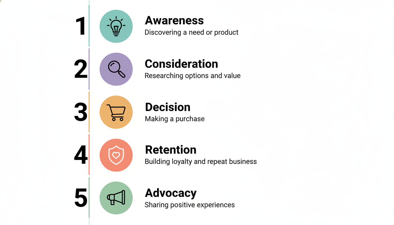 The five main stages are: Awareness (they discover a need or your brand), Consideration (they evaluate their options), Decision (they make a purchase), Retention (they continue using your product or service), and Advocacy (they recommend you to others).