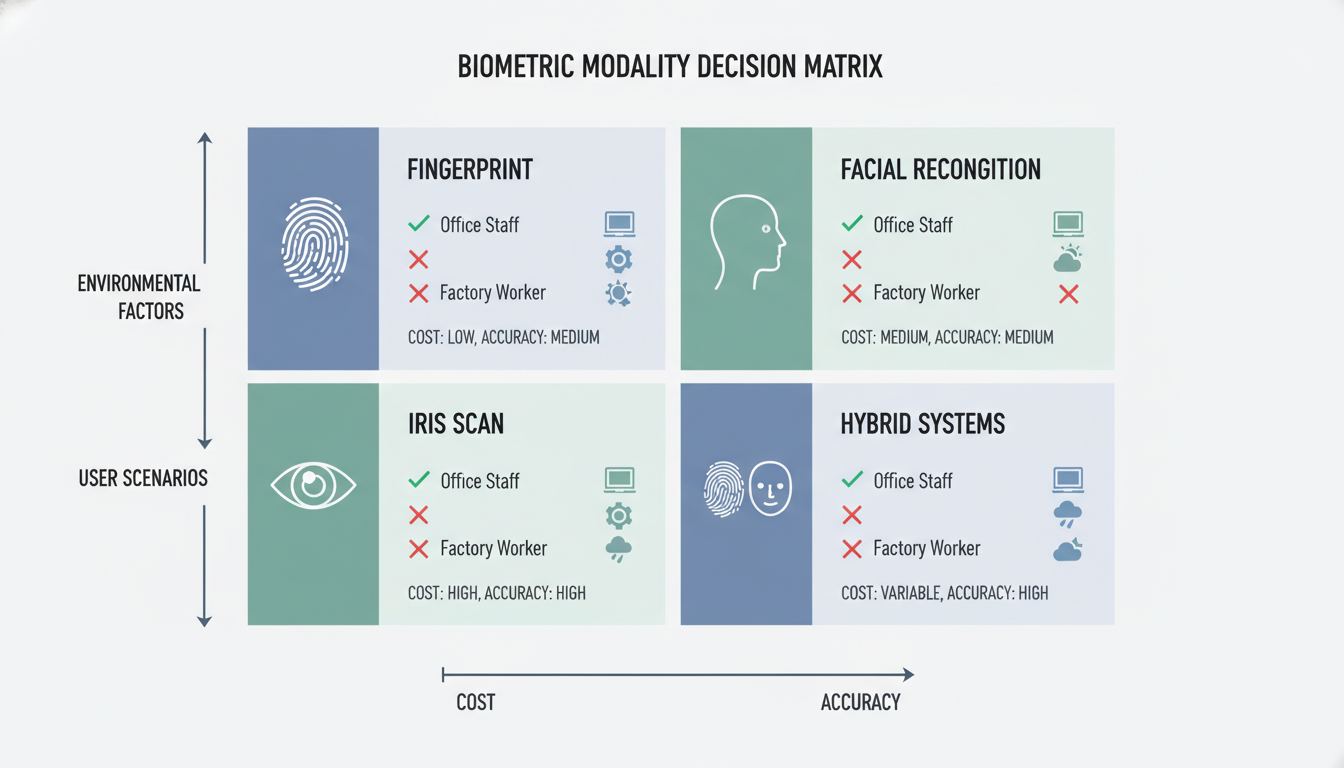 Use iris recognition when security is critical and budget allows. Government offices, research facilities, and high-security zones benefit from this accuracy. The technology works through glasses and doesn’t change with age, making it reliable long-term.