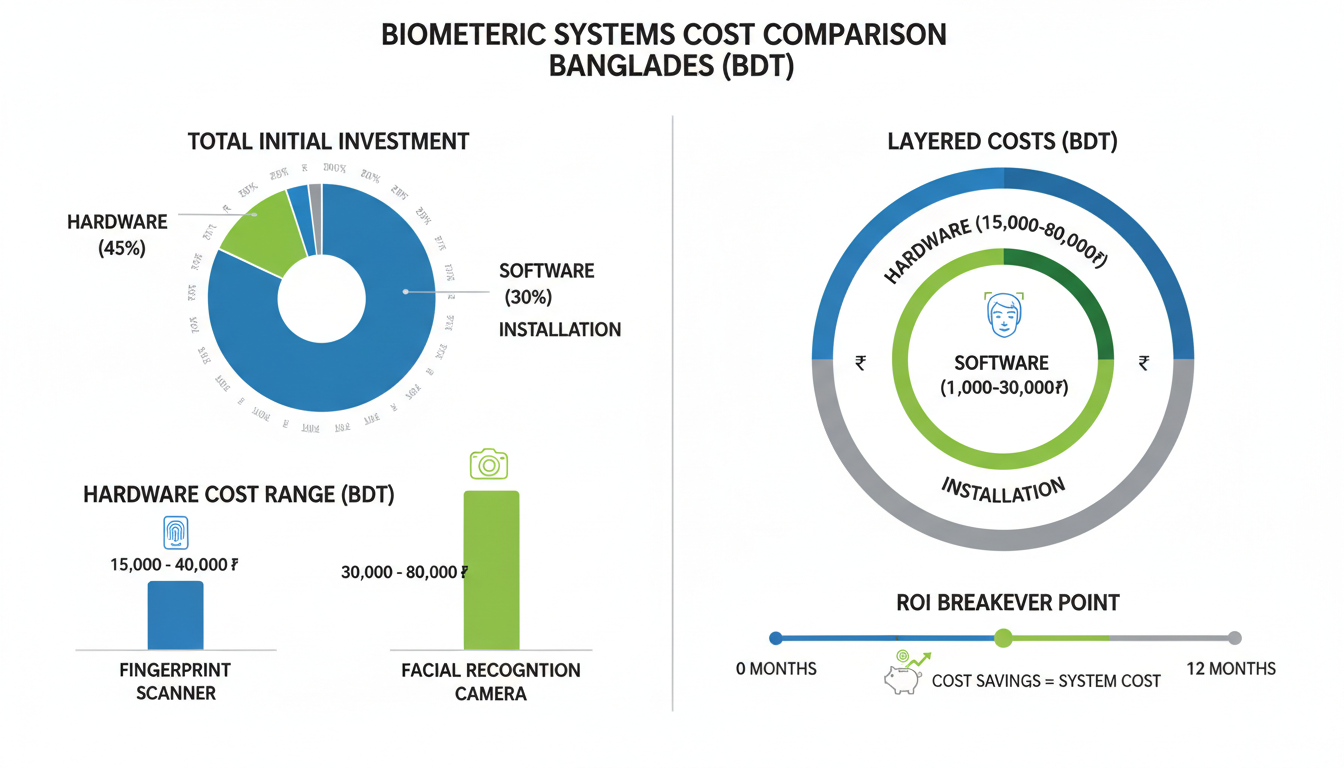 Basic fingerprint systems start around 15,000 to 25,000 BDT per device. Facial recognition systems range from 30,000 to 80,000 BDT. Software costs vary—some vendors charge per user per month (100-300 BDT), while others offer one-time licenses (50,000-200,000 BDT). For a 100-employee company, expect total first-year costs of 150,000-400,000 BDT.