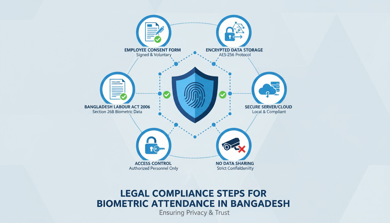 Yes, biometric attendance is legal and increasingly common. The Bangladesh Labour Act permits various attendance tracking methods as long as accurate records are maintained. However, you must handle biometric data responsibly obtain employee consent, protect the data, and use it only for attendance purposes.