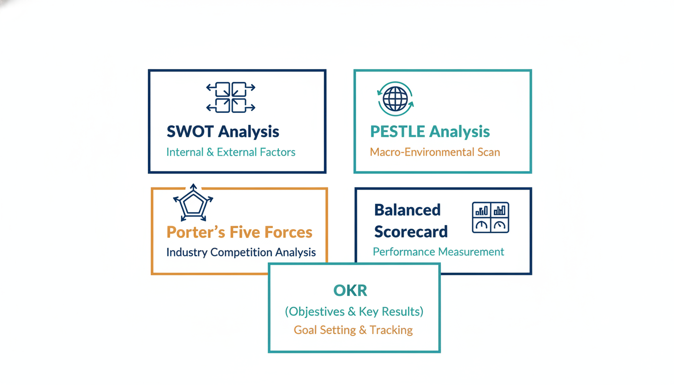 A strategic management framework is a structured tool or model that helps organizations analyze their situation, make strategic decisions, and track progress. Common frameworks include SWOT analysis, Porter’s Five Forces, the Balanced Scorecard, and OKRs.