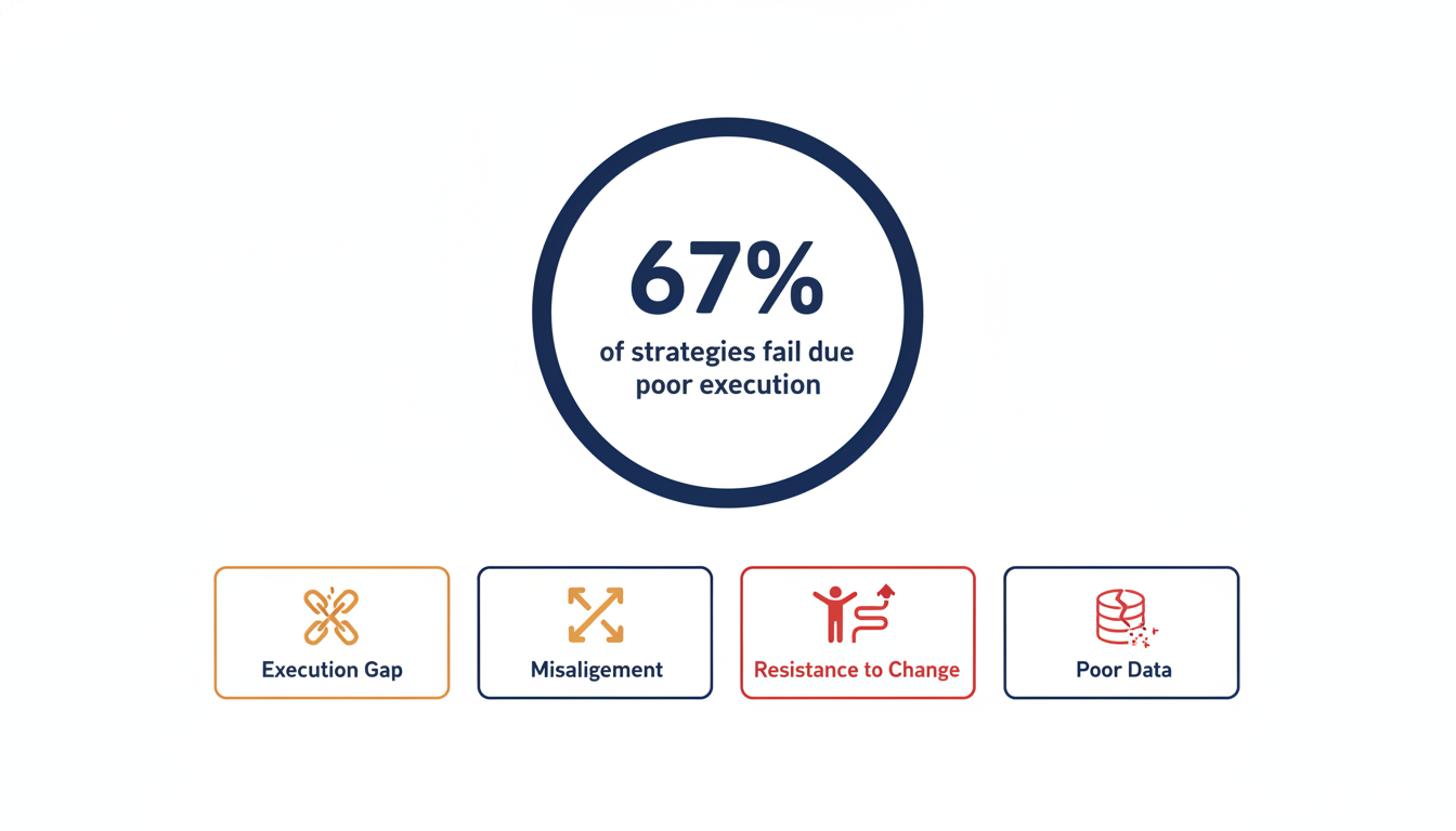 Here is a sobering fact. According to research by Quantive, 67% of well-formulated strategies fail because of poor execution. That means most organizations that have a strategy still cannot make it work. The gap between planning and doing is where most businesses lose.