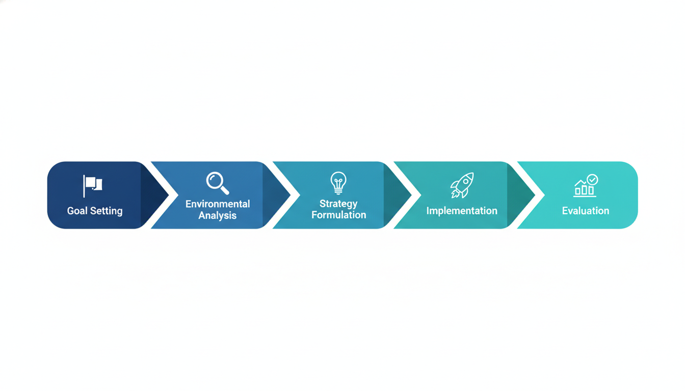The strategic management process is a structured approach that helps organizations move from where they are to where they want to be. Most experts break it down into five clear stages.