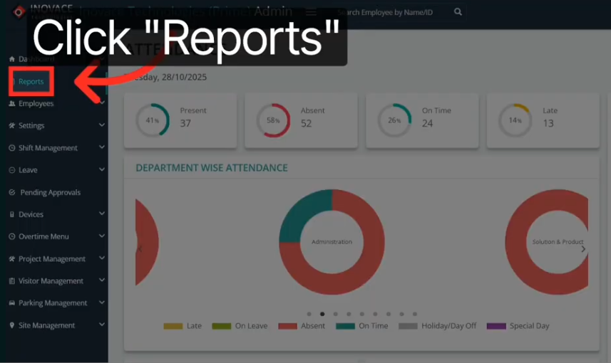 The Inovace Technologies tutorial shows this clearly. The Reports section is your analytics engine. Every field visit, every GPS punch, every captured image flows into this section for your review.
