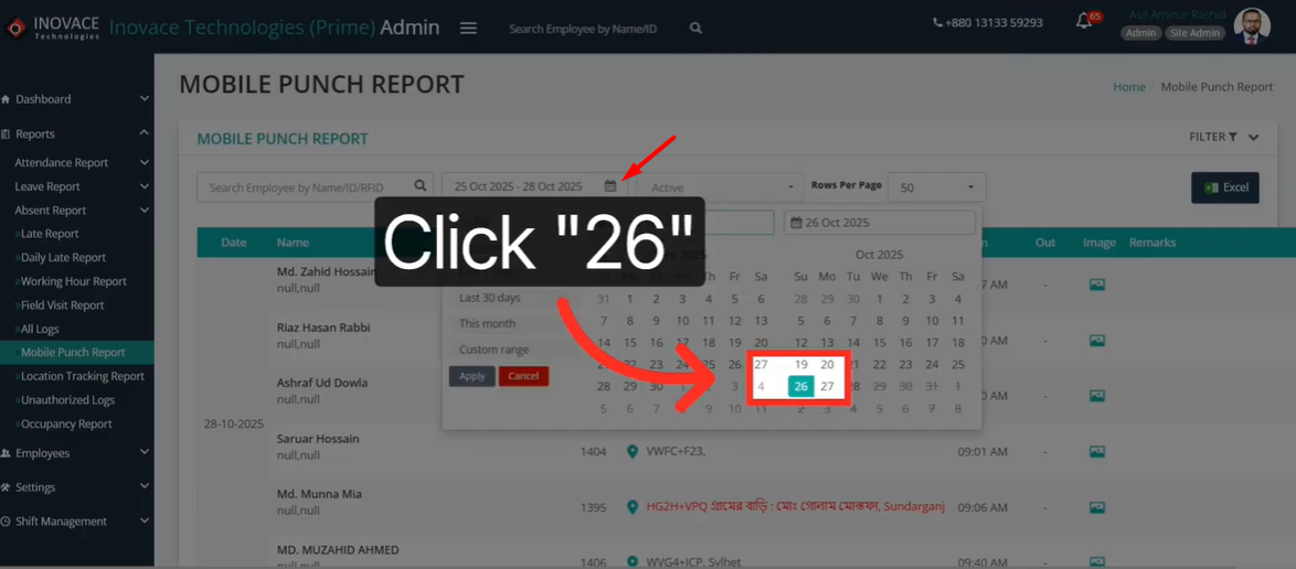 Once you confirm your date range, the system will load the attendance and location records for that window. It only takes a second.