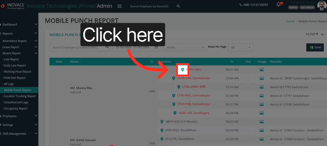 - Click the location pin icon to see the exact GPS coordinates of where they clocked in.