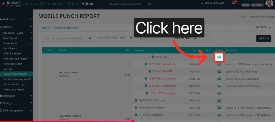 - Click the image icon to view the live photo captured at check-in. This confirms visual presence at the location.