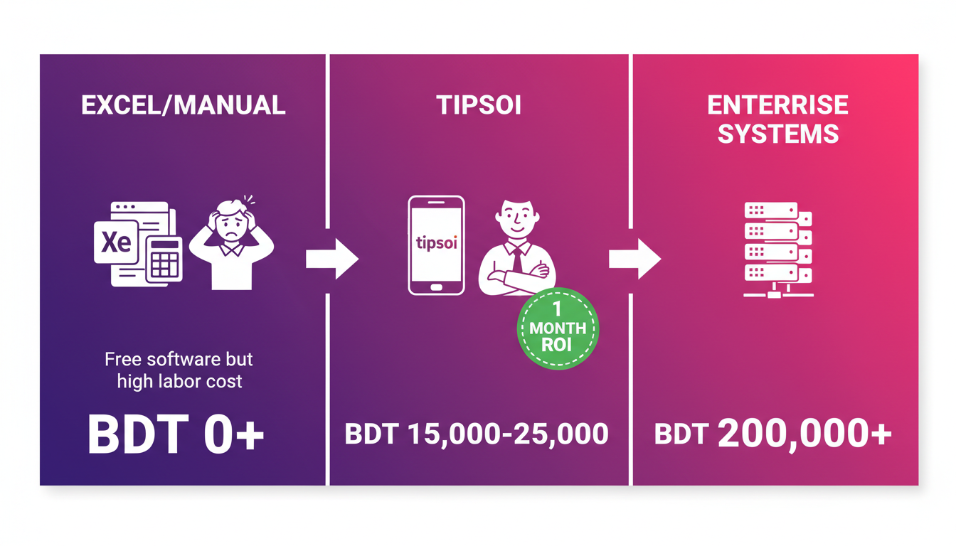 Excel creates errors and doesn’t scale. Enterprise systems cost BDT 2-10 lakh+ monthly with lengthy setup. Tipsoi offers enterprise capabilities at BDT 15,000-25,000/month with 1-2 day implementation.